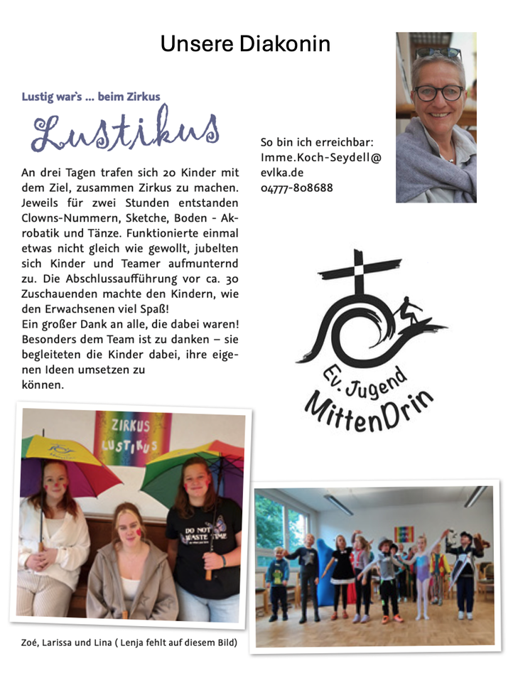 So bin ich erreichbar: E-Mail: Imme.Koch-Seydell@evlka.de --- Telefon: 04777/ 808688