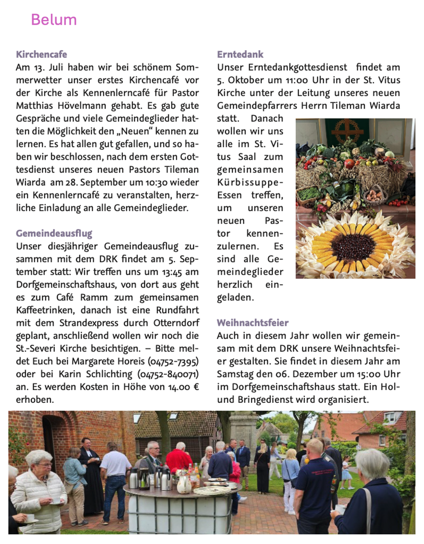 Höhepunkte unseres Kirchenjahres sind Konfirmation und Erntedankfest, Schützenfest – Gottesdienst und Kirchenfest im Sommer.